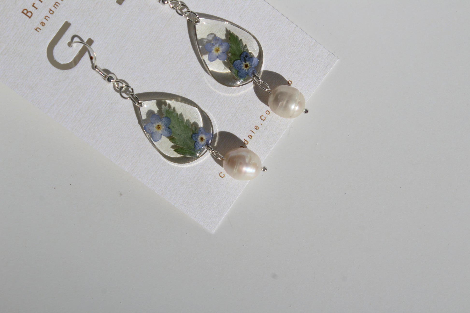 Soft, romantic, and full of delicate detail, these handmade earrings feature real pressed forget-me-not blooms and greenery preserved in crystal-clear resin, finished with a luminous pearl drop for an elegant botanical touch.