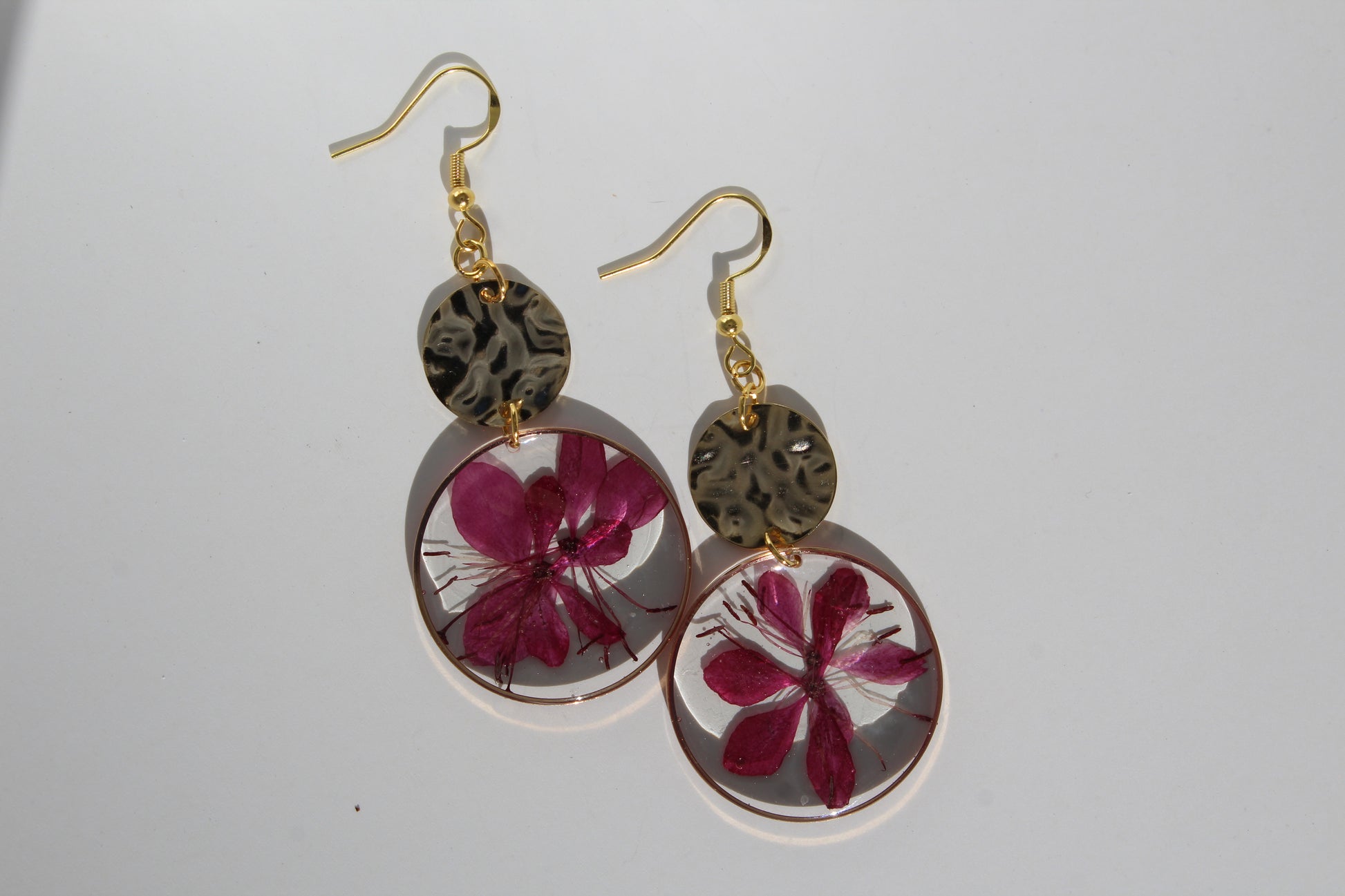 Bold yet delicate, these handmade earrings feature real pressed pink blooms preserved in crystal-clear resin and framed in a modern circular setting. Paired with a textured hammered gold accent, they create a striking balance between natural beauty and elevated design.