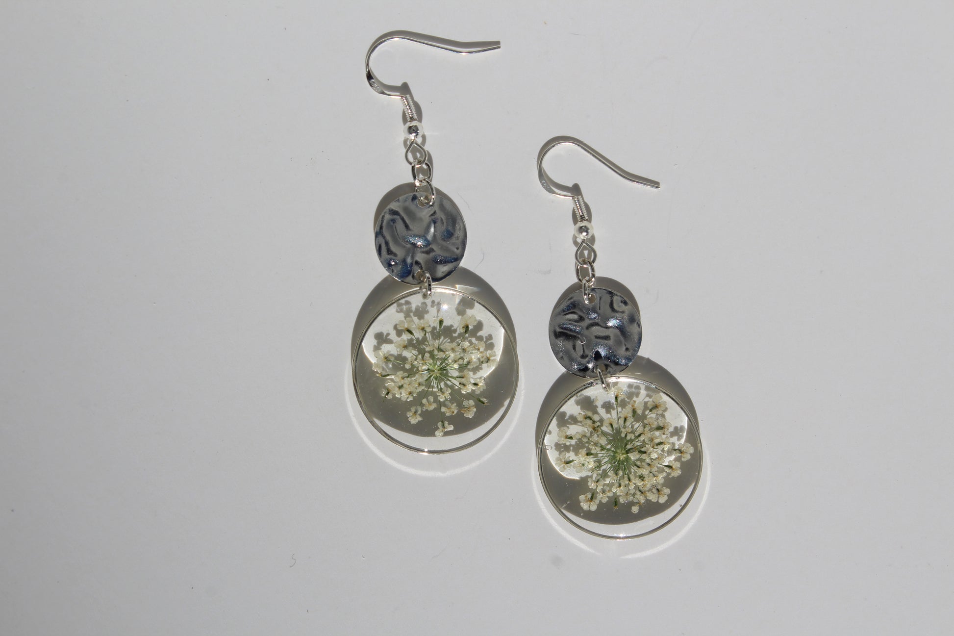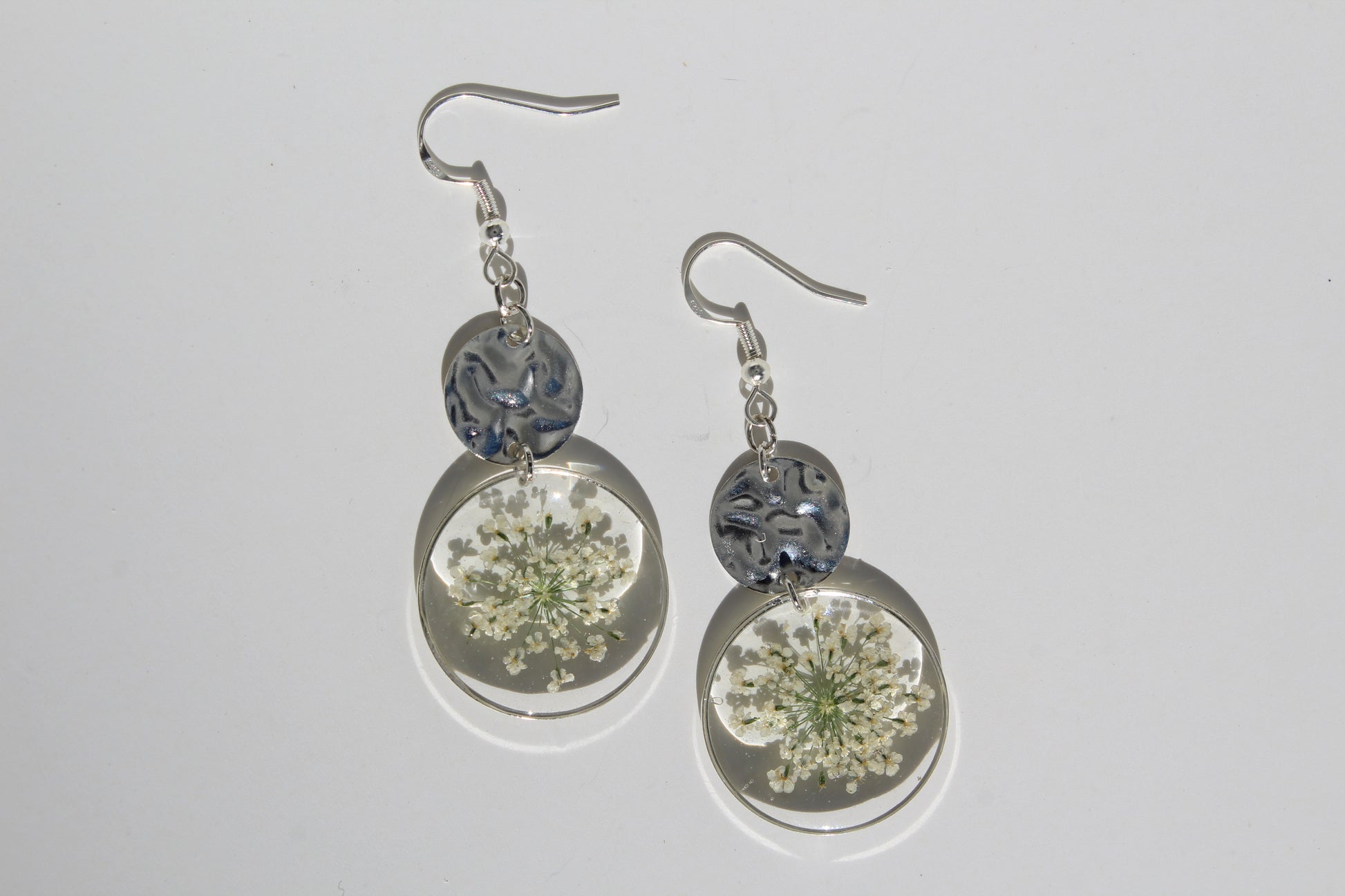 Soft, airy, and beautifully detailed, these handmade earrings feature real pressed Queen Anne’s lace-style blooms preserved in crystal-clear resin and framed in a delicate circular setting. Finished with a textured silver-tone accent, they create a light and elegant botanical statement inspired by wildflower fields and delicate lace-like petals.